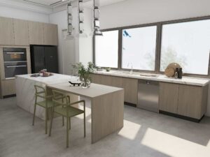 Architectural Grace: An L-shaped layout seamlessly integrates with a central island, maximizing both form and function. The symmetry of design elements, from cabinetry to countertops, evokes a sense of balance, making the space both inviting and grand. Glass components juxtaposed with metal laminates serve to amplify the room’s spaciousness and light. Material Excellence: The use of a rare natural veneer underlines the kitchen’s luxury quotient. With years of expertise, this veneer radiates a unique elegance, further elevated by the expansive quartz stone, which beautifully captures and refracts ambient light.