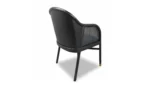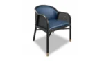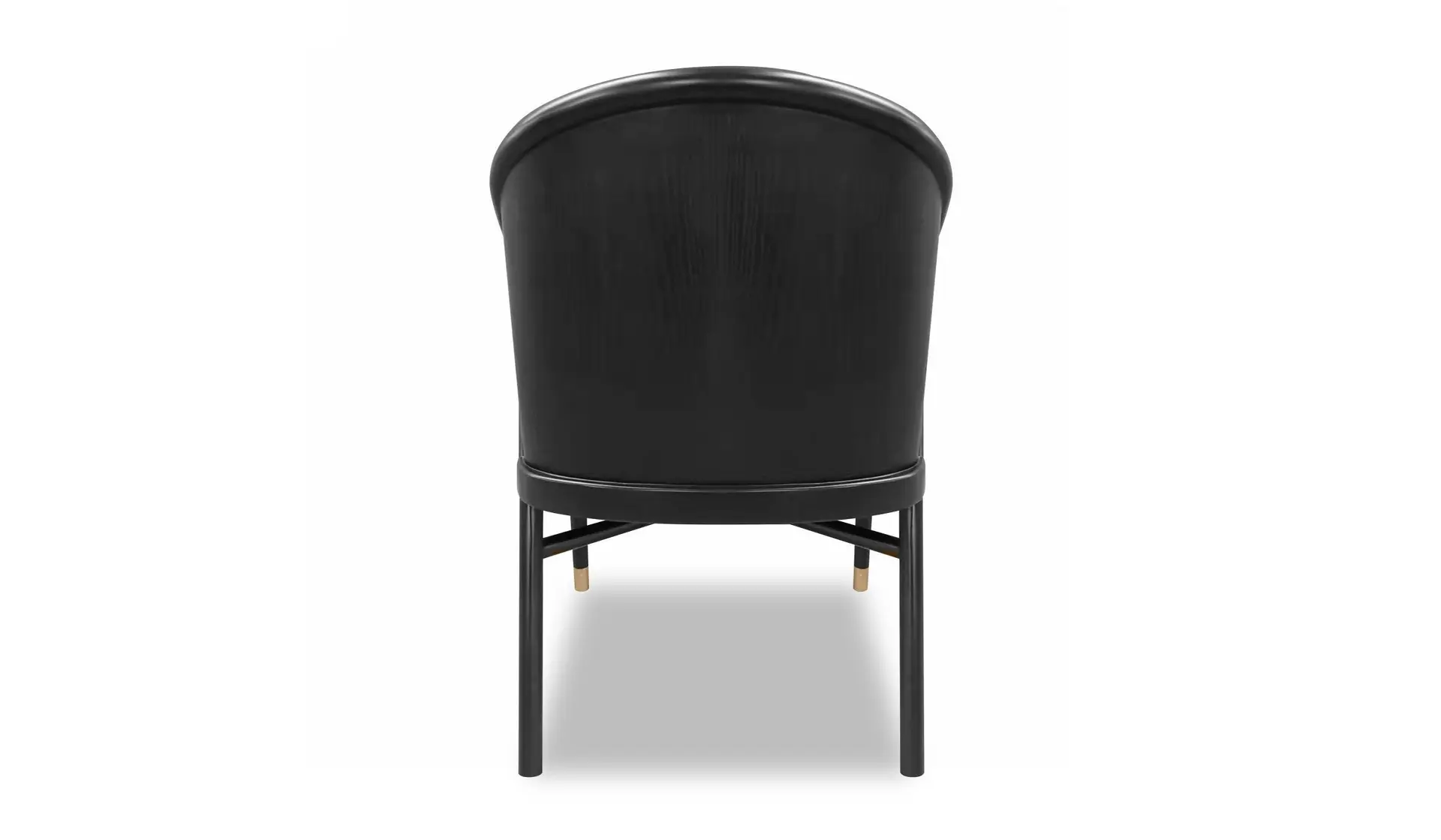 Sculptural dining chair with bent wood frame. Tightly upholstered inside back with self-welt and tight seat. Featuring synthetic open weave woven cane inset panels at arms. Exposed finished curved veneer panel at outside back. Featuring fully finished solid wood frame, legs and X-stretcher. Exposed finished 2"H stainless steel sabots at front legs.